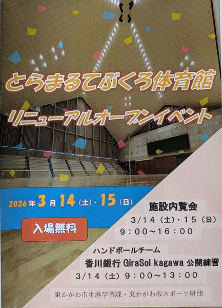 RSS(別ウィンドウで開きます) 一覧へ戻る とらまるてぶくろ体育館内覧会のお知らせ2026-02-16[施設情報,イベント]注目オススメ 以下の期間、とらまるてぶくろ体育館改修工事に伴い、大内スポーツセンター全ての施設(テニスコート、多目的広場、キャンプ場、ゲートボール場)を臨時休館いたします。ご利用の皆様には、大変ご不便・ご迷惑をおかけしますが、どうかご理解を賜りますよう、宜しくお願い申し上げます。 休館期間 令和7年6月10日(火)~6月16日(月) なお、人形劇場とらまる座、とらまる人形劇ミュージアム、ミニチュア児遊館は通常通り利用できます。※6月16日(月)は定期休館日です。